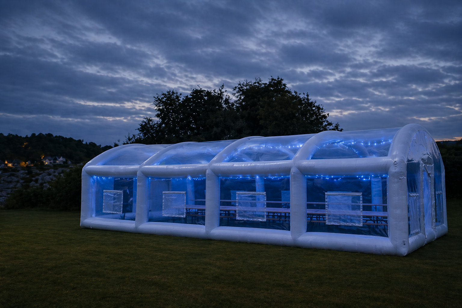Teltet vårt er oppblåsbart og klart på rundt 15 minutter – uten at du trenger å løfte en finger. Vi kjører ut, setter opp og sørger for at alt står stødig før vi drar. Du bruker dagen på det du faktisk skal – ikke på å slåss med stenger i hagen.